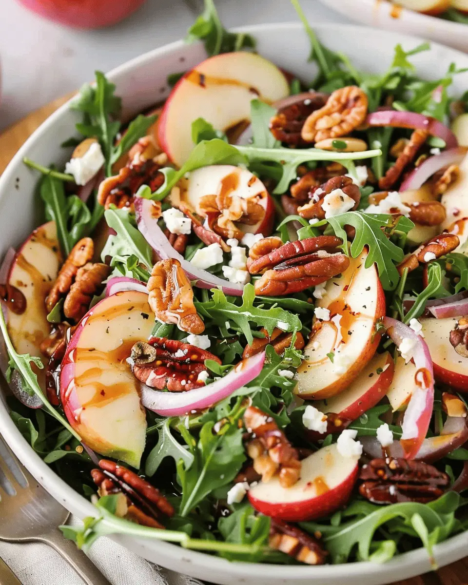 As you take that first bite, notice the contrasts: the peppery arugula, sweet apples, toasted pecans, and the tangy dressing all working in harmony. Enjoy the satisfying crunch and nourishing goodness; you’ve just created a meal that brings together vibrant healthfulness and rich flavors. Bon Appétit!
