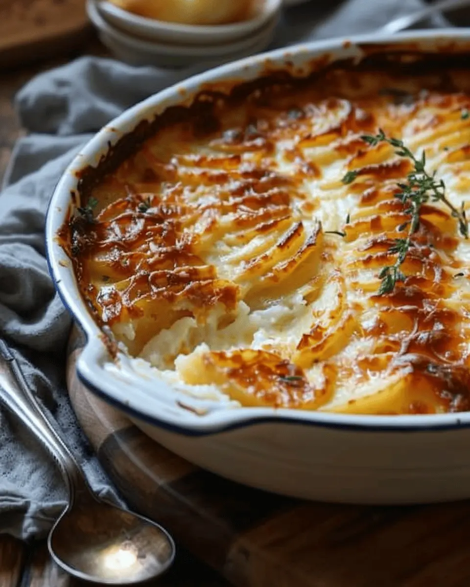Now, let’s create that luscious creamy sauce that makes this dish irresistible. You’ll need to melt 4 tablespoons of butter in a medium saucepan over medium heat. Once melted, whisk in ¼ cup of all-purpose flour to create a roux, cooking this mixture for about 1–2 minutes until it’s golden. Gradually add in 2 cups of chicken broth (or any low-sodium broth of your choice) while continuing to whisk vigorously. This will avoid any lumps and help combine the flavors perfectly. Simmer for a minute until it thickens, and then stir in 1 cup of heavy cream. Top it off with a hearty sprinkle of salt, pepper, and your favorite herbs such as thyme or rosemary. When the sauce is smooth and creamy, you’ll know it’s ready for the star ingredient—potatoes.