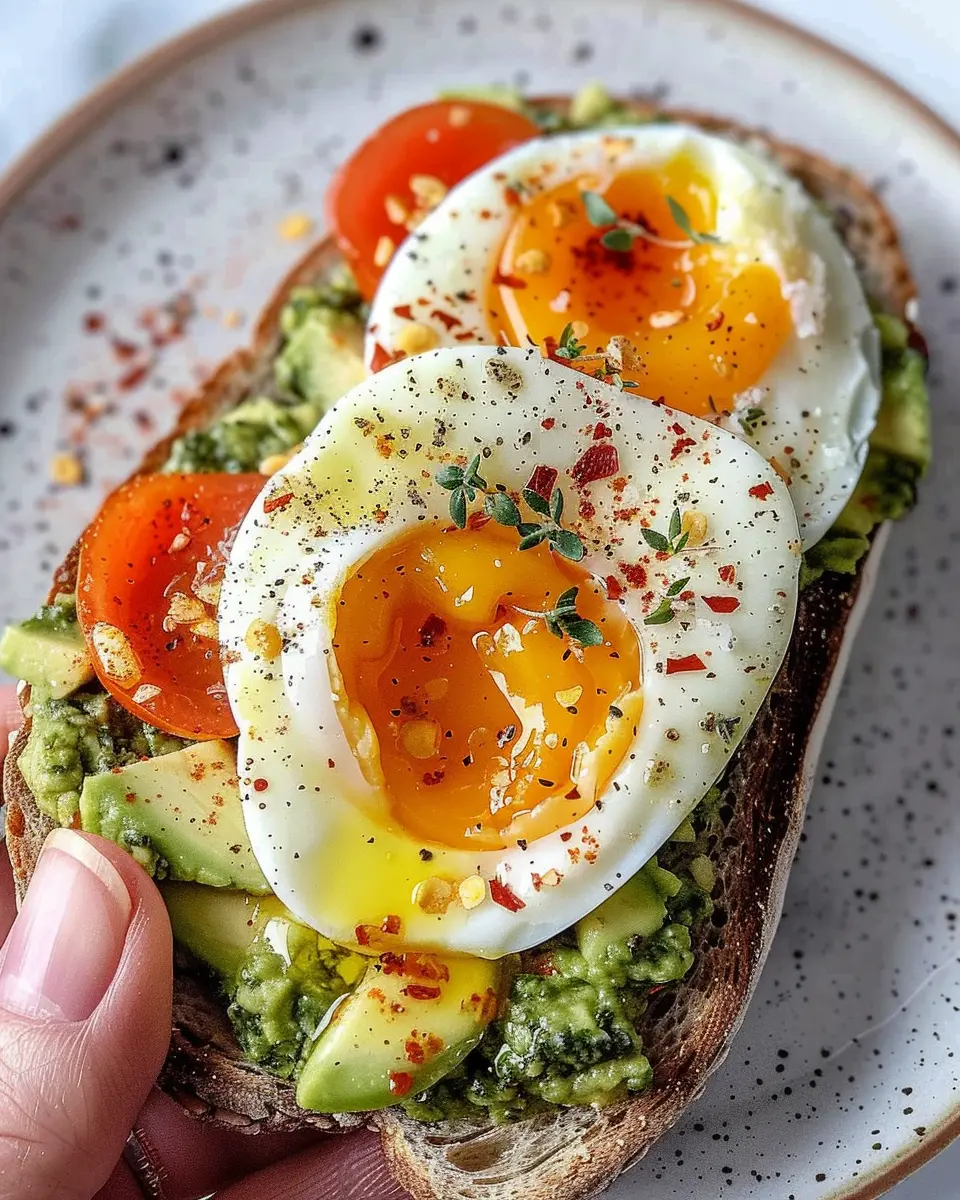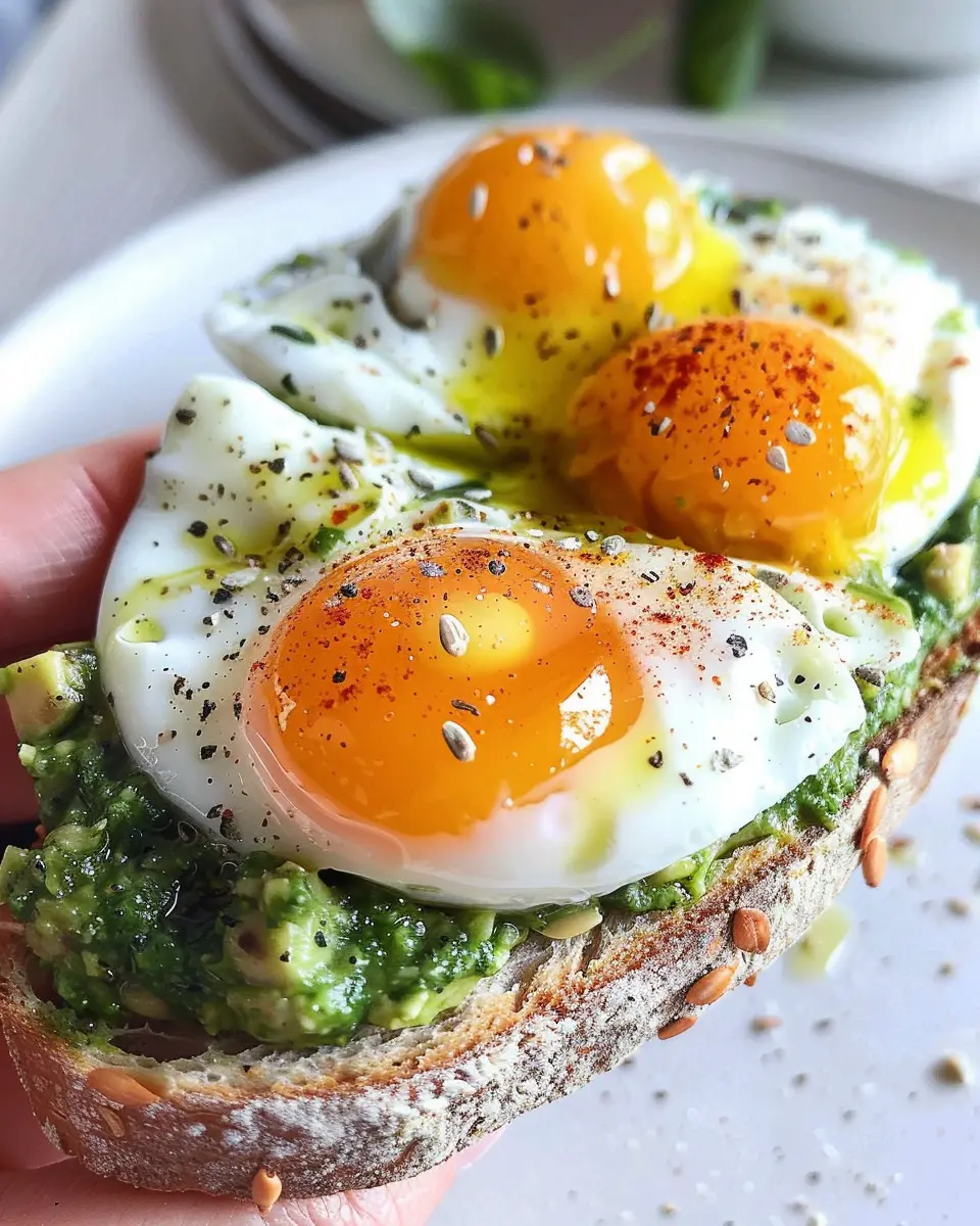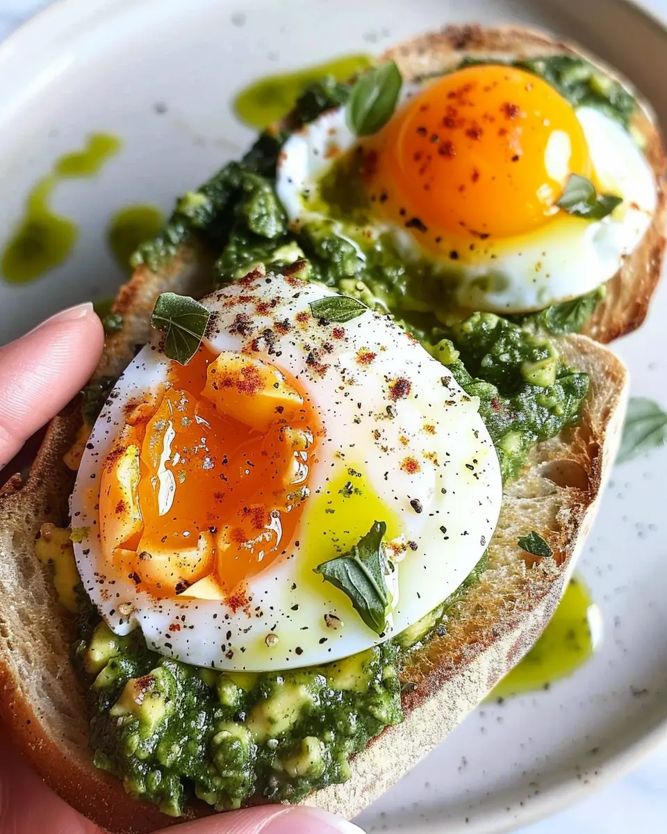 Moreover, creating your Jammy Egg, Avocado & Pesto Toast allows for personalization. Perhaps you prefer a sprinkle of chili flakes for a spicy kick or a drizzle of balsamic vinegar for that sweet tangy finish. You can experiment based on your taste, creating a breakfast experience unique to you. Plus, preparing this toast can be a delightful ritual to start your day; the smell of toasting bread paired with the vibrant hue of fresh ingredients lightens your mood and energizes you for the day ahead.