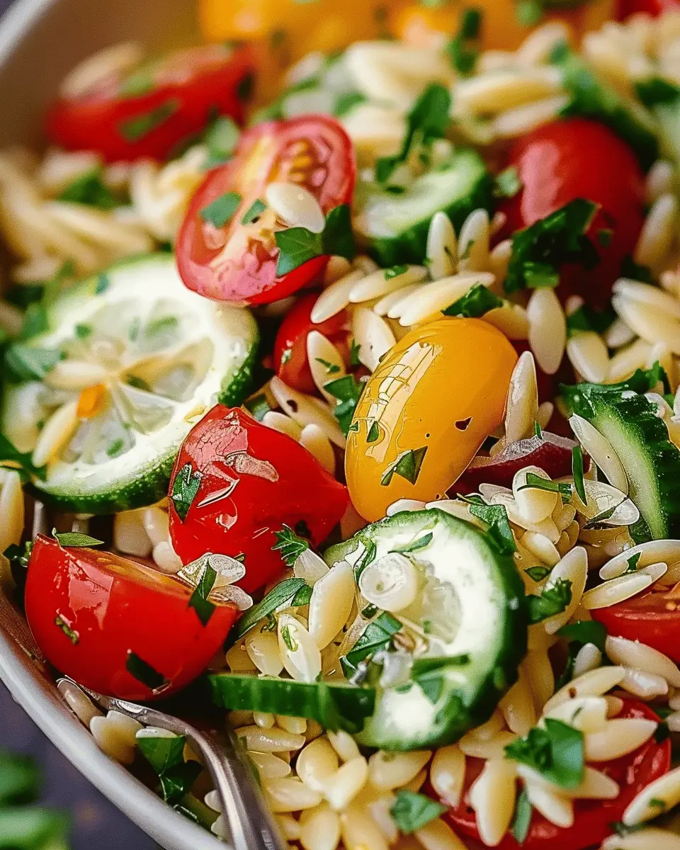 Remember, the key here is to be gentle—you don’t want to break up that lovely orzo! This salad can also serve as a substantial side dish or a vibrant main course.