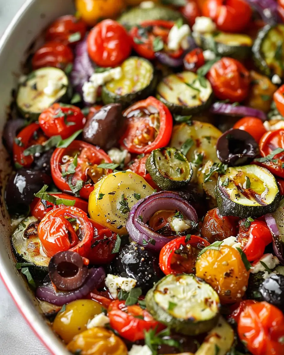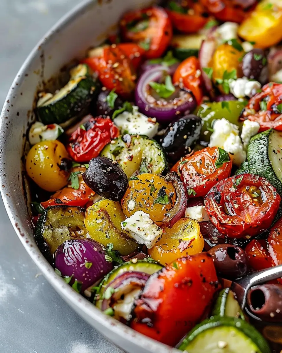 One serving of this one pan Greek vegetables recipe contains approximately 150 calories. It’s light yet filling, making it perfect for lunch or dinner. You can easily adjust the portion size without guilt!