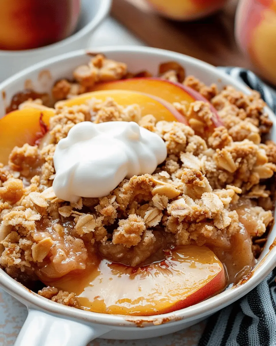 If you’re looking for a lighter option, consider topping your peach crisp with a dollop of whipped cream or Greek yogurt. The tanginess of the yogurt cuts through the sweetness of the peaches, creating a refreshing balance. Plus, yogurt adds a healthy touch with its probiotics! For an Instagram-worthy finish, drizzle some honey or sprinkle cinnamon over the top.